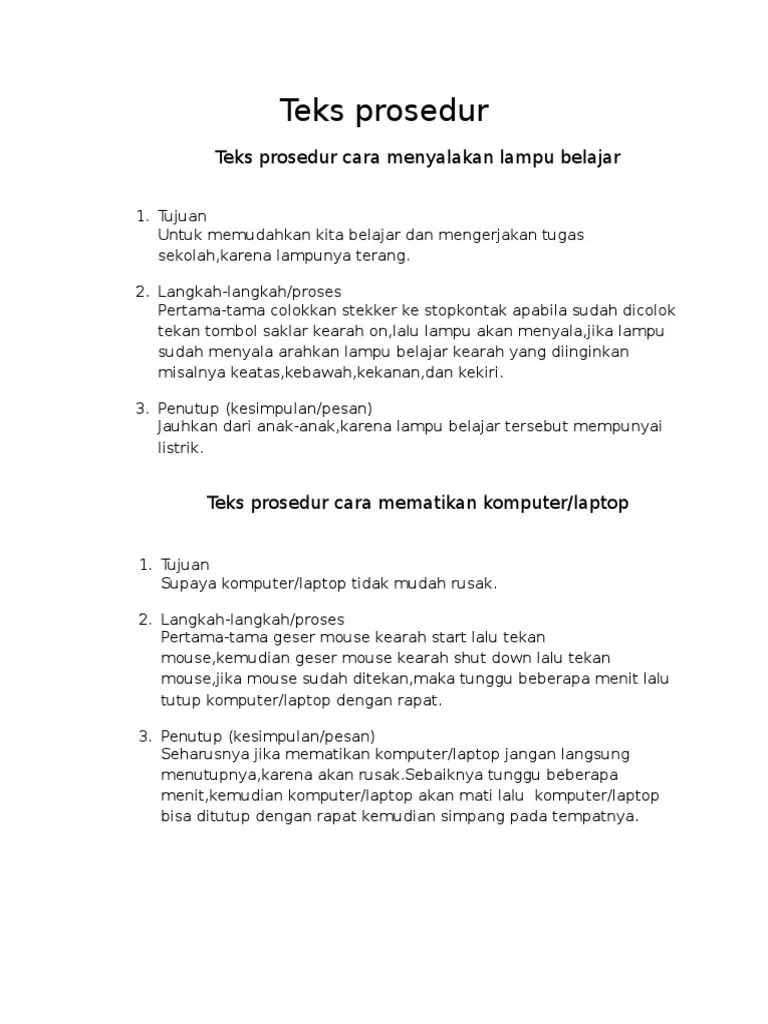 6 ~ menanya tentang cara menyusun teks prosedur berdasarkan kerangka yang telah dibuat sesuai struktur. Lalu, siapkan kertas maupun plastik dan letakkan di bawah kerangka tersebut. Kedudukan pembelajaran memproduksi teks prosedur kompleks. Dan salah satunya adalah jenis teks prosedur kompleks. Teks prosedur adalah karangan petunjuk teknis.